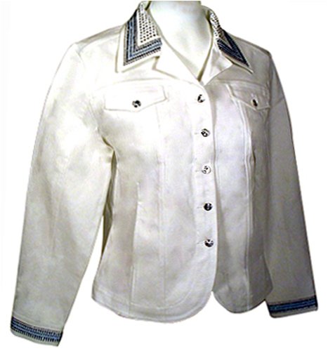 Christine Alexander Denim and Spandex White Colored Fitted Jacket Accented With Swarovski Crystals and Turquoise around Collar, Sleeves and Buttons Review