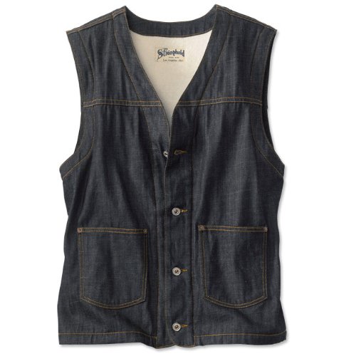 Inspired by a vintage style popular a century ago, this rugged pure cotton vest—crafted in America by The Stronghold of Venice, California—has a warm Sherpa-fleece lining. The Stronghold is one of the oldest denim brands in the USA (and the first to manufacture in Los Angeles), dating to the end of the 19th century. To this day, The Stronghold pairs old-world craftsmanship and the finest materials to create heirloom-quality clothing built to stand the test of time. Two drop-in front pockets. Four-button front closure. In indigo. Pure cotton body. Washable. USA. Sizes: S(34-36), M(38-40), L(42-44), XL(46-48), XXL(50-52).