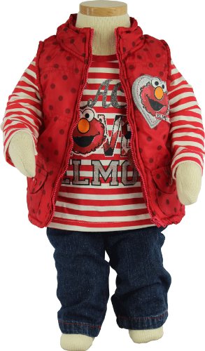 This sweet Sesame Street "Peace Love Elmo" 3-piece infant girls vest set will look adorable on any little Sesame Street fan. Set features a puffer vest, long sleeve top and denim pants. Sesame Street vest is has a polka dot print with an Elmo applique. Top is red and white stripe with glittered screen print "Peace Love Elmo" graphic featuring Elmo's face. Denim pants have a half elastic waist for comfort and fit with faux button detail.