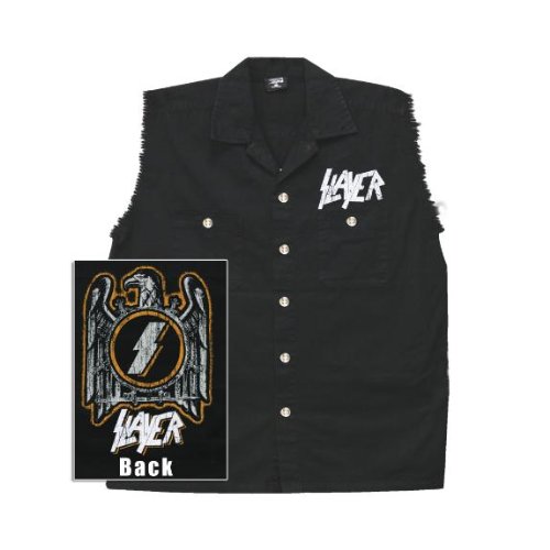 This black, sleeveless denim button-up from Slayer features the band's logo on the left breast, with a print of their eagle emblem on the back, as well as two front pockets with flaps and frayed edges around the arms. An awesome shirt for Slayer fans who tired of plain old t-shirts!