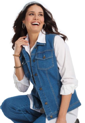 The perfect transitional layer is at a torso flattering length. Our plus size vestis an instant denim classic.must-have fashion layershirt collarbutton frontfront shaping seamsside and button flap pocketsbottom band with adjustable button tabs27' longwashable woven cotton/spandex, imported Women's plus size vest and plus size jacketin sizes 12W, 14W, 16W, 18W, 20W, 22W, 24W, 26W, 28W, 30W, 32W, 34W